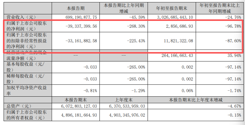 根据报告,东岳硅材第三季度实现营收6.99亿元,同比减少45.59%;归属于上市公司股东的净利润为-3933.74万元,同比大减268.30%;扣非净利润为-3316.19万元,同比减少225.43%;加权平均净资产收益率-0.81%,同比减少1.29个百分点。